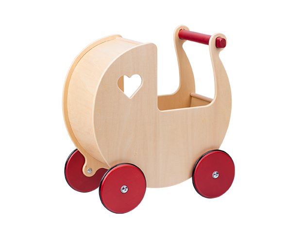 The doll's pram is made of high-quality birch veneer and supplied with massive wooden wheels with rubber tires. The back is made of one piece of moulded thin veneer. It is delivered assembled, ready for use.